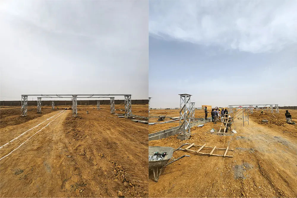Tudi pri lokalni temperaturi, ki je dosegla 35,6 stopinje Celzija, se posadka premika hitro. Sestavni deli iz pocinkanega jekla so zdaj na tleh in pripravljeni za postavitev. Te strukture so zgrajene tako, da obvladujejo velike zahteve 330 kV transformatorske postaje in zagotavljajo dolgoročno stabilnost lokalnega električnega omrežja.